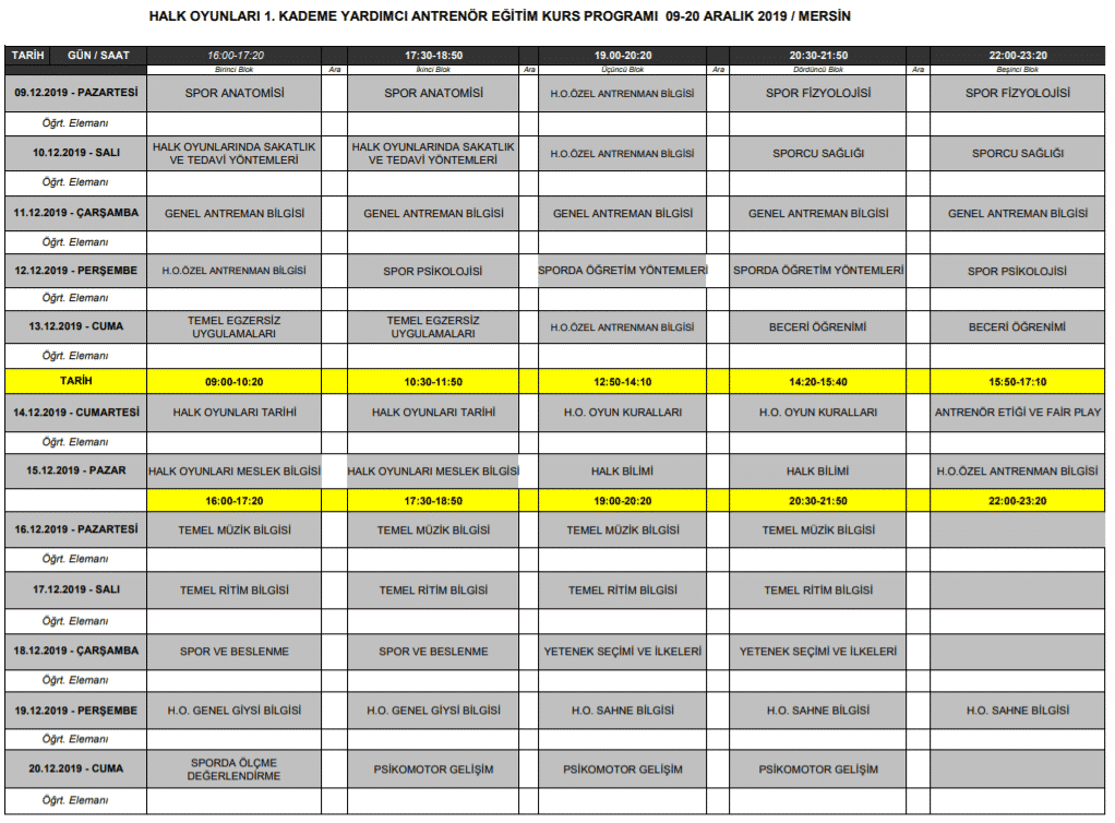 Türkiye Halk Oyunları Federasyon tarafından Aralık 2019 tarihleri arasında Mersin’de açılması planlanan 1. kademe yardımcı antrenörlük kursu ile ilgili kurs programı ve kursiyer yani katılımcı listesi yayımlandı. Aşağıda ilgili bağlantılara ve duyuruya ulaşabilirsiniz.