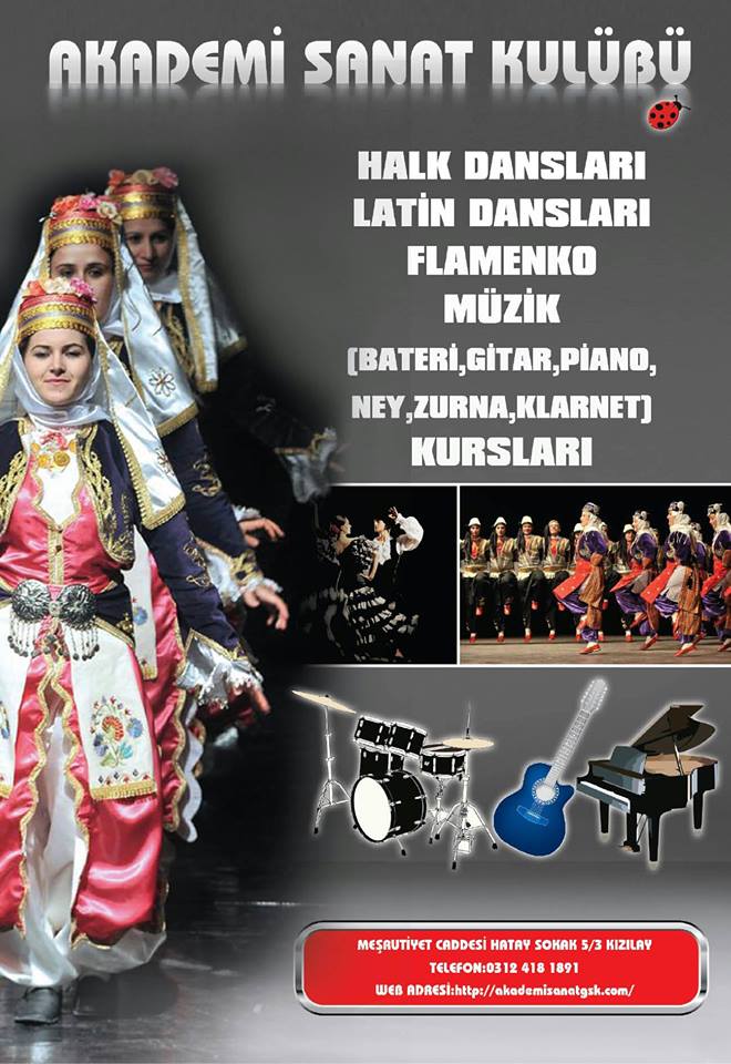 Ankara’da GAZİ ÜNİVERSİTESİ mezunlarınca kurulmuş bir eğitim kurumu. Yurt içi yurt dışı festivaller, yarışmalar ve gösteriler için halk oyunları kurs kayıtları başladı. Sende dans etmek ve gezmek istiyorsan bekliyoruz.