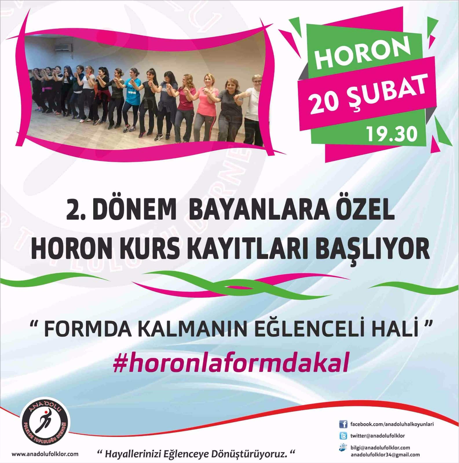 Sıfırdan başlayacak kadınlar horon kursu ilk çalışması 20 Şubat 2017 Pazartesi Saat 19.30‘da Üsküdar’da Anadolu Folklor Topluluğu dernek merkezinde başlayacaktır. Sizleri de aramızda görmek isteriz.